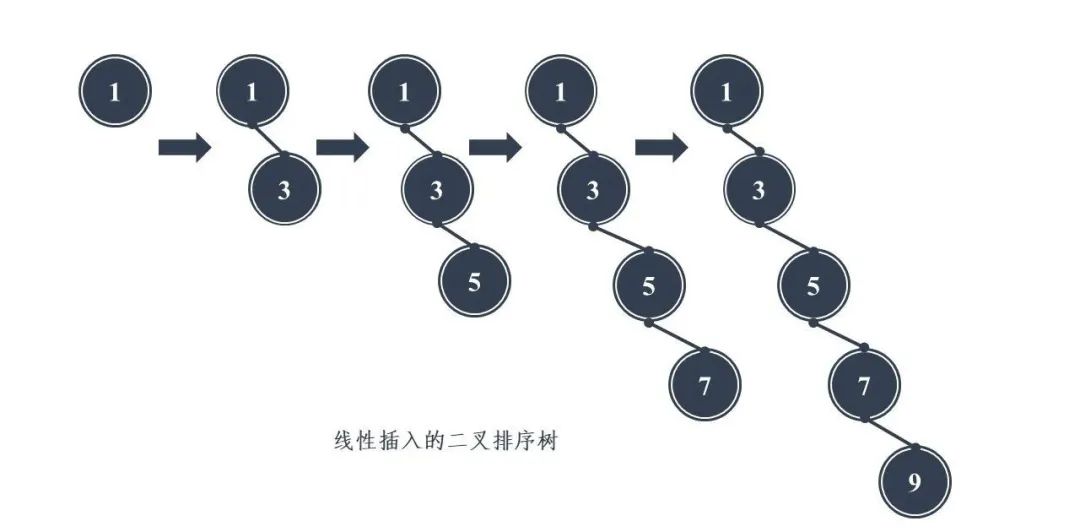 平衡二叉树的产生是为了解决二叉排序树在插入时发生线性排列的现象。由于二叉排序树本身为有序,当插入一个有序程度十分高的序列时,生成的二叉排序树会持续在某个方向的字数上插入数据,导致最终的二叉排序树会退化为链表,从而使得二叉树的查询和插入效率恶化。