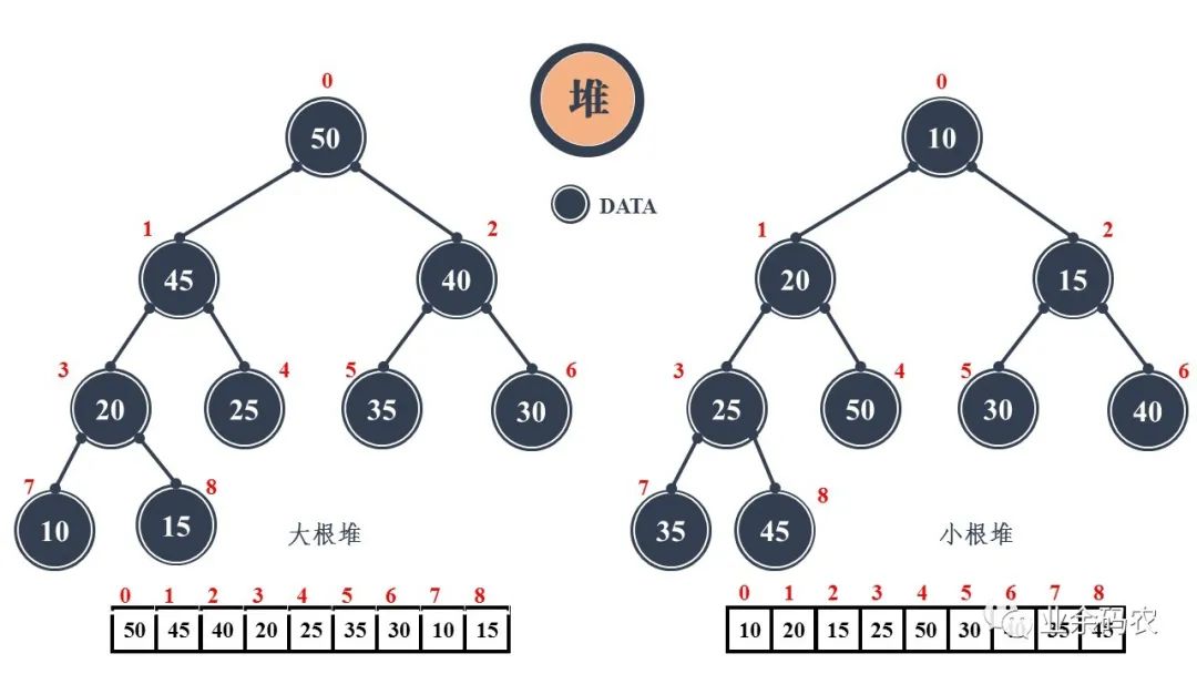 了解完二叉树,再来理解堆就不是什么难事了。堆通常是一个可以被看做一棵树的数组对象。堆的具体实现一般不通过指针域,而是通过构建一个一维数组与二叉树的父子结点进行对应,因此堆总是一颗完全二叉树。