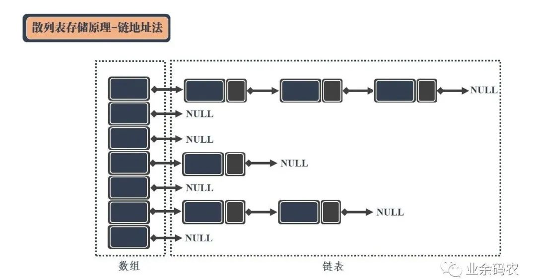 左侧数组的每个成员包括一个指针,指向一个链表的头。每发生一个冲突的数据,就将该数据作为链表的节点链接到链表尾部。这样一来,就可以保证冲突的数据能够区分并顺利访问。