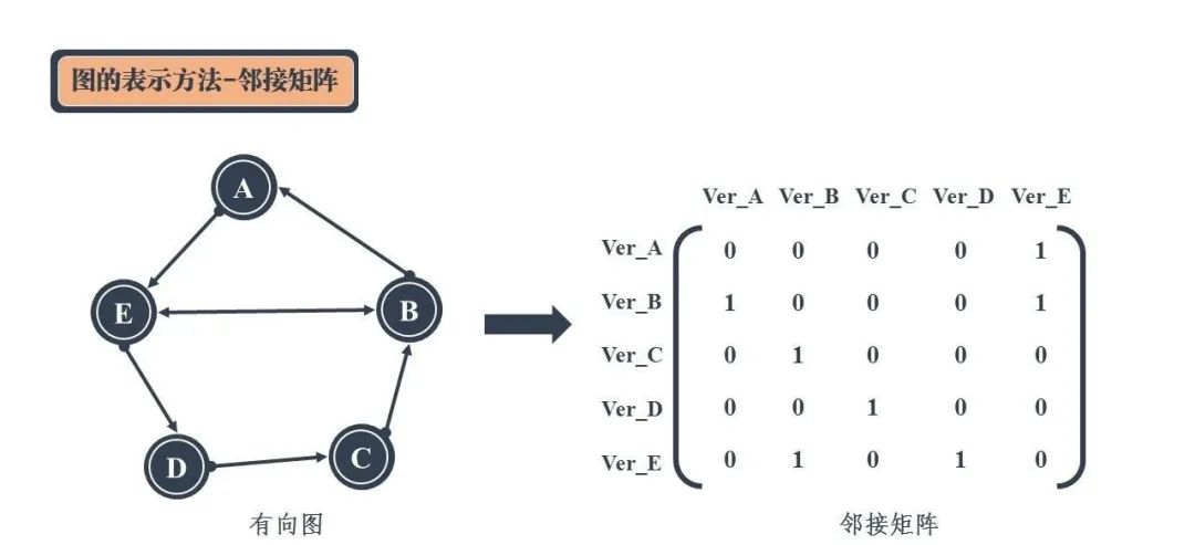 在邻接表中,每一个顶点都对应着一条链表,链表中存储的是顶点能够达到的相邻顶点。存储的顺序可以按照顶点的编号顺序进行。比如上图中对于顶点B来说,其通过有向边可以到达顶点A和顶点E,那么其对应的邻接表中的顺序即B->A->E,其它顶点亦如此。