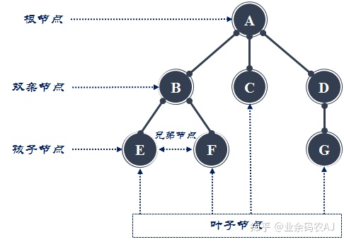 对于树中的某个结点,最多只和上一层的结点有直接的关系,而与其下一层的多个结点有直接关系。其上一层的结点称为双亲结点,下一层的结点称为孩子结点。所有位于树的最底部,没有孩子结点的结点被称之为叶子节点。具有相同双亲的结点互为兄弟节点。