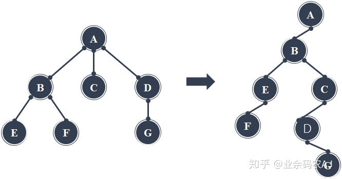看起来似乎有些诡异的形状,每个结点都作为链表的一个节点,通过两个指针分别指向第一个孩子结点和下一个兄弟结点。为了防止大家看不懂,我举个例子。拿结点B来说,它的第一个孩子结点是E,而它的下一个兄弟是与它处于同一层级的C。因此结点B的两个指针分别指向了E和C。