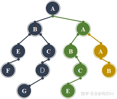 然后将绿色二叉树作为蓝色二叉树根节点的右子树,将黄色二叉树作为绿色二叉树根节点的右子树,就可以得到森林转换为二叉树的结果。