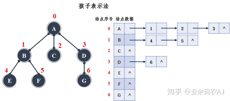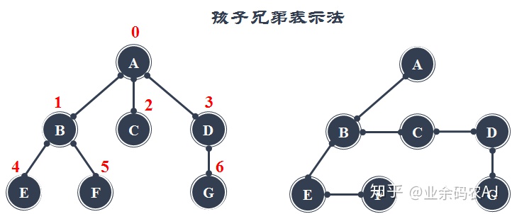 在孩子兄弟表示法中,我们约定只存储每个结点的第一个孩子结点和下一个兄弟结点。不仅如此,结点的存储是通过链表进行的。话说不太清,还是直接看图吧。