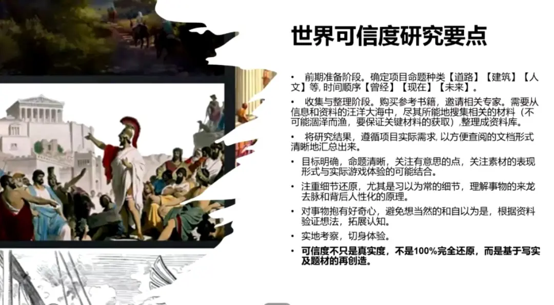 在研究阶段,我们一般会花上两到三个月的时间,去做大量的可信度查证工作,包括当地建筑、人文、地理、历史、当地故事、经济等等,输出一份世界可信度研究文档,内容量可能相当庞大。