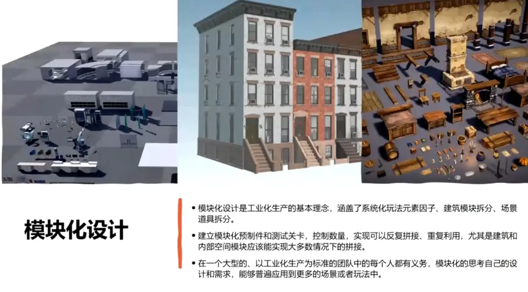 这时我们会进行更多的模块化设计。它是工业化生产的基本理念,涵盖了系统化玩法元素因子、建筑模块拆分、场景道具拆分等。
