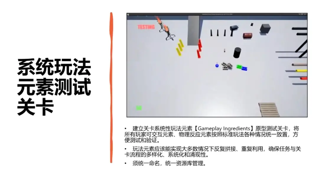 在白模阶段,系统策划还会搭建一个系统化玩法元素(Gameplay Iingredients)的原型测试关卡,将所有玩家可交互的元素、物理化学反应元素,按照标准玩法的各类情况统一放置,方便反复测试和验证。