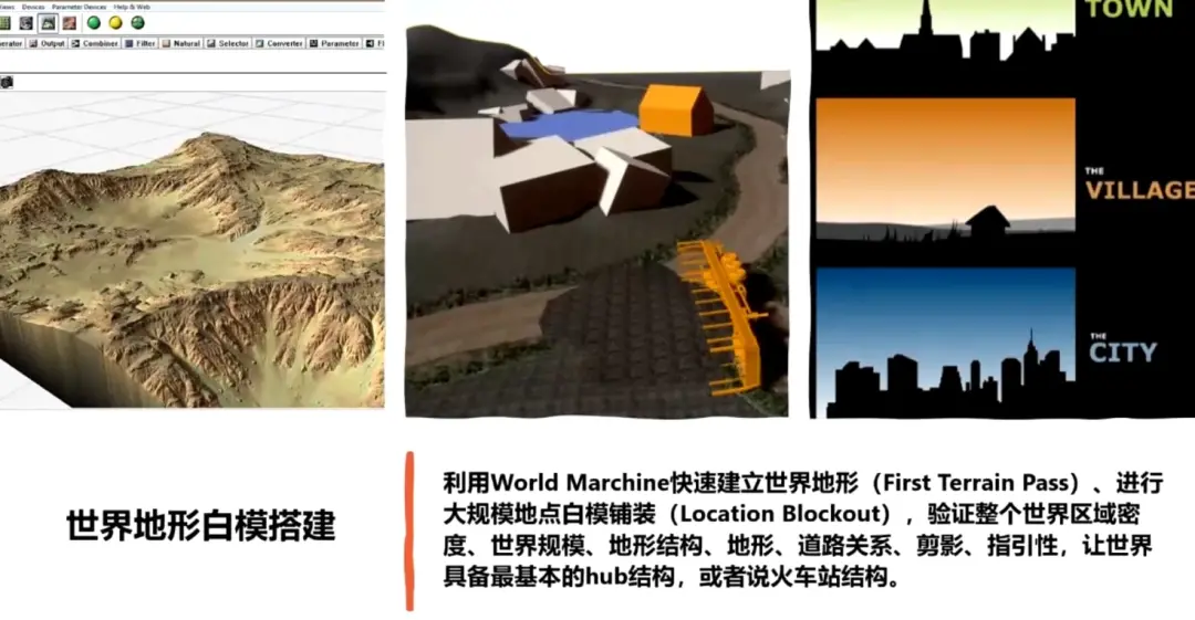 这时,我们会根据世界设计文档或区域设计文档,利用地形生成软件 World Machine 快速建立世界地形,我们一般称之为 First Terrain Pass,并在此基础上进行大规模地点的白模铺装,如下图所示。
