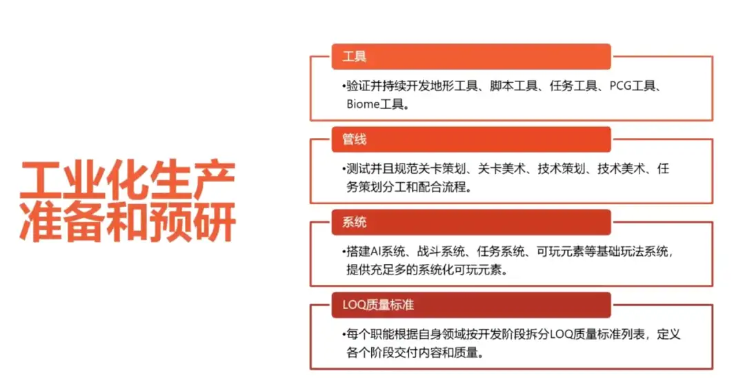 确认了标准参数、玩法与想法,设计流程暂时告一段落,进入到工业化大规模生产的准备和预研环节,主要包括以下四个方面:
