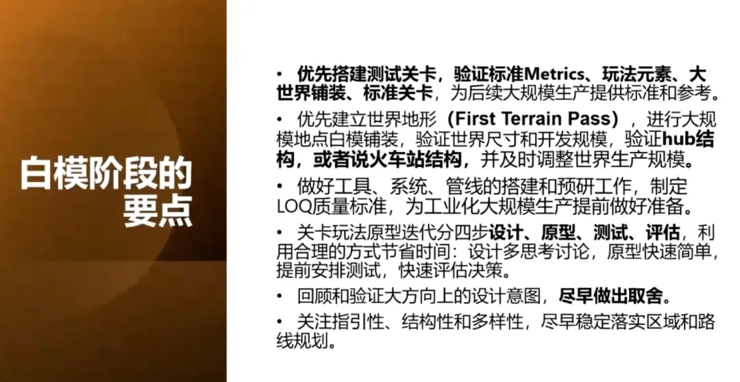 这一时期追求的是L1级的质量交付标准。大家可以看到“文档”“白模”“可玩”之间存在几个双向箭头,意在强调这一时期反复验证、反复迭代过程的必要性与持续性,因为到了正式投产后,就不会再做大规模修改了。