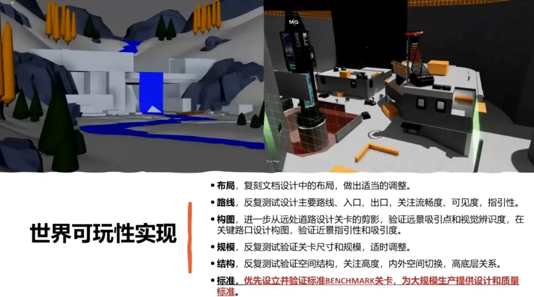 如果说白模阶段关注的是设计意图和开发规模,那么可玩阶段关注的是世界可玩性的实现: