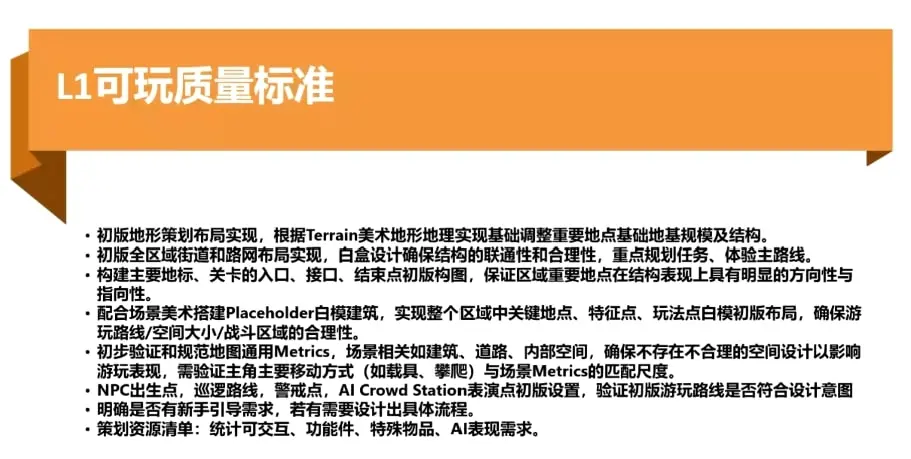 下图是我结合自己关卡策划的经验,认为在可玩阶段应该达到的L1质量标准,其中包含较多个人看法,不完全等同于育碧的工业化标准,仅为大家作为一些参考: