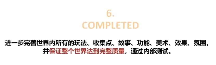 话归正题,在“完成”阶段,整个世界框架已经完全确立,团队进行纯粹的填充工作,即按照原有的规划设想,进一步完善世界内所有的玩法、收集点、故事、功能、美术、效果、氛围等,并保证整个世界达到完整质量,通过内部测试。