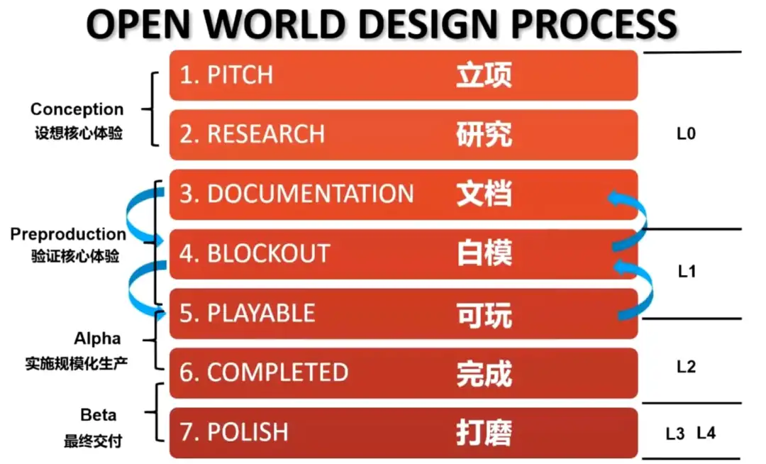 开放世界游戏的开发,往往分为 Conception、Preproduction、Alpha 和 Beta 4个节点,经历“立项、研究、文档、白模、可玩、完成、打磨”共 7 个阶段。