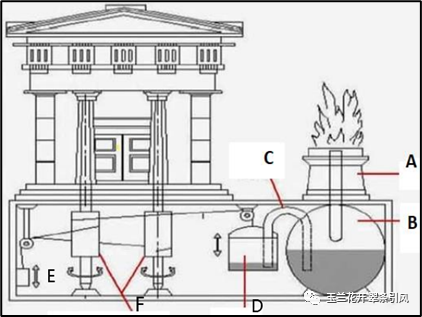 公元50-60年期间,古希腊数学家希罗(Hero,10 A.D.~ 70 A.D.)发明了自动开关庙门、自动分发圣水、自动贩卖机等具有开环控制思想的装置。如图5(右)所示,自动打开庙门的装置为世界上最早以气压和重力为动力的自动门,点火后B中空气膨胀,水进入D,利用水的重力使得轴F转动,将门打开。当火熄灭时,庙门在重锤E作用下自动关闭,因此这是一个开环控制系统。