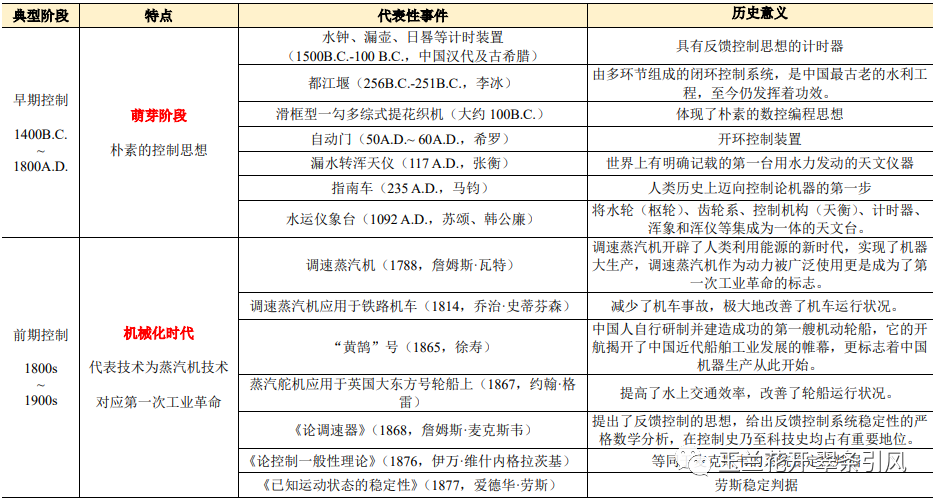 控制理论发展简史由自动控制技术对人类进步的无数个贡献组成。表1.1为控制理论发展简史的五个典型阶段、每个阶段的特点及其代表性事件。从中不难看出,在早期控制阶段,朴素的控制思想为提高人类生产生活质量服务;在前期控制阶段,控制理论与机械化紧密相连;在经典控制阶段,控制理论与电力技术共同发展;在现代控制阶段,控制理论与数字化同频共振;在智能控制阶段,控制理论与智能化的关系也是可预判的。未来还会有更多的阶段,只是目前我们尚可展望第五个阶段。以动力和信息变革为主要特征的四次工业革命贯穿于控制理论发展简史,但终究都是一场关于机器的革命。
