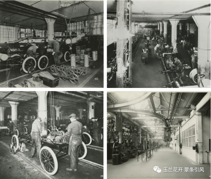 图15 在福特T型汽车底盘装配线上,车架、车轴、油箱、发动机、仪表盘、车轮、散热器和车身等按顺序组装。工人将从高架平台滑下、且内有汽油的邮箱连接到底盘上,以便于在生产线末端的整车可被直接开走(1914年)(左上)。在底盘装配线的仪表板安装过程中,工人将点火线、火花和油门控制装置连接到发动机上,并将转向柱连接到前桥的横拉杆上(1915年)(右上)。一名工人将T型驱动轴连接到变速器上,另一名工人使用链式起重机将发动机降到底盘上进行安装(1913年)(左下)。使用高架单轨输送机在车间以及工厂周围运送零件,该输送机轨道超过1.5英里,贯穿整个工厂(1914年)(右下)[26]。