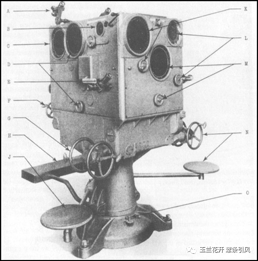 图17 斯佩里T-6 人工伺服防空火炮控制器(此图片来源于美国“哈格利博物馆和图书馆”(Hagley Museum and Library))。A.望远镜;B.上下方向仪表盘和手轮;C.水平方向仪表盘;D.超高仪表盘和手轮;E.方位跟踪望远镜;F.水平方向手轮;G.横向手轮(方位角跟踪);H.发射指挥官平台。J.方位跟踪操作员座位;K.时间关闭指示灯和手轮;L.当前高度仪表盘和手轮;M.当前水平量程仪表盘和手轮;N.高程跟踪手轮和操作员座椅;O.定位夹具。