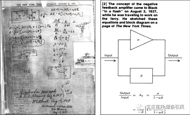图18哈罗德·布莱克写在纽约时报上的负反馈放大器手稿(左)[32]及后期整理的手稿上的核心内容(右)[29]