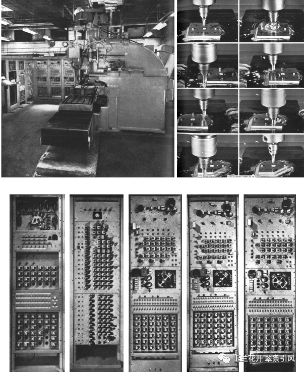 图25 第一台数控铣床(左上)、该机床的三坐标运动:刀具的垂直移动、刀具在工作台上的横向滑动以及工作台的左右移动(右上)和数控铣床上同时协调三轴运动的控制系统面板(下)[55]