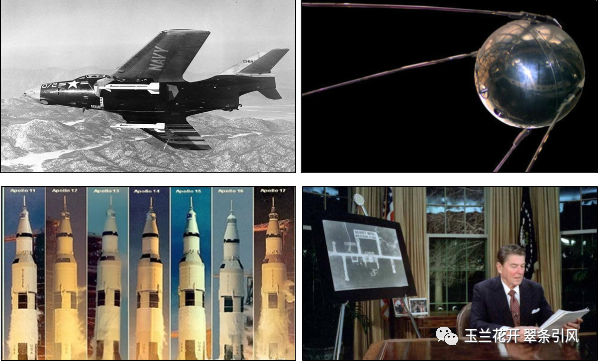 图28美国海军F-9F战斗机挂载AIM-9B“响尾蛇”空空导弹(左上,1956);全球首颗人造卫星苏联 Sputnik I(右上,1957);美国航天飞机Apollo 11-17(左下,1961-1972);时任美国总统罗纳德·里根宣布星球大战(Star Wars Program)正式开始(右下,1983)。以上图片均来自维基百科。