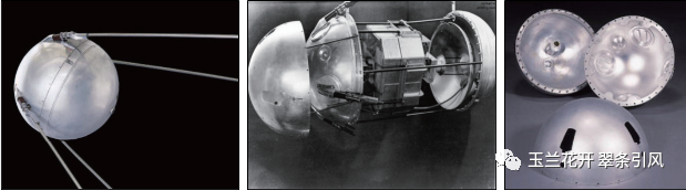 图30 世界上第一颗人造地球卫星Sputnik I的外形(左)、结构(中)、外壳(右)[69]
