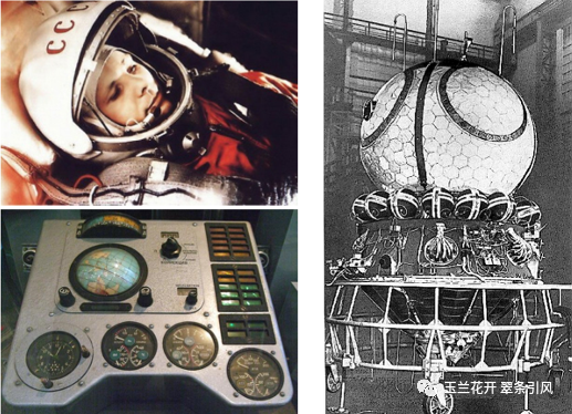 图34 尤里·加加林(左上)、东方一号控制面板(左下)和东方一号载人太空舱(右)(图片来自维基百科)