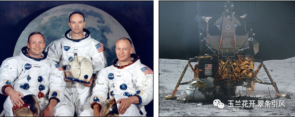 图37 由左至右分别为指挥长尼尔·阿姆斯特朗、指挥舱“哥伦比亚号”驾驶员迈克尔·科林斯、登月舱驾驶员巴兹·奥尔德林(左)和阿波罗11号登月舱“鹰号”全貌(右)(图片来自维基百科)