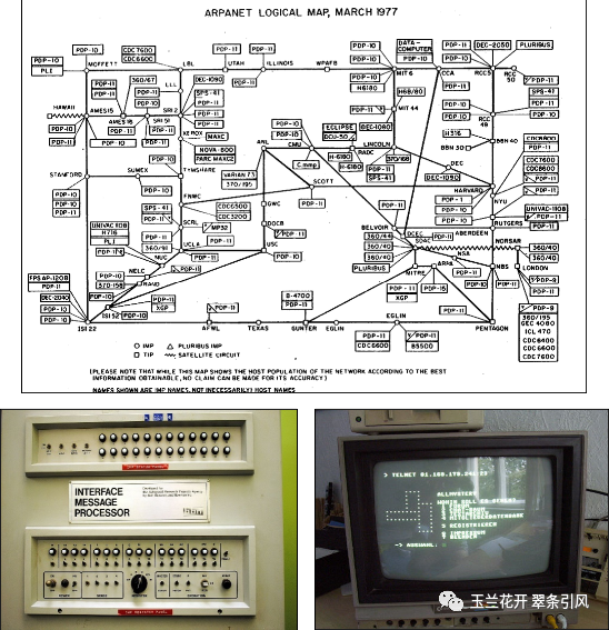 图39 阿帕网逻辑图(上,1977)、路由器(左下,1969)和操作界面(右下,1988)(图片来自维基百科)