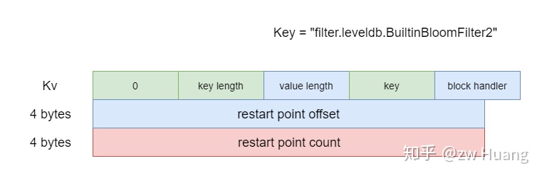 - 剩下三个是控制信息,Meta Index Block存储了指向Filter Block的指针,根据这个指针可以找到某个Filter Block开始的位置,以及其所占用的空间,这个指针的键是Meta Block的名称,值是一个
