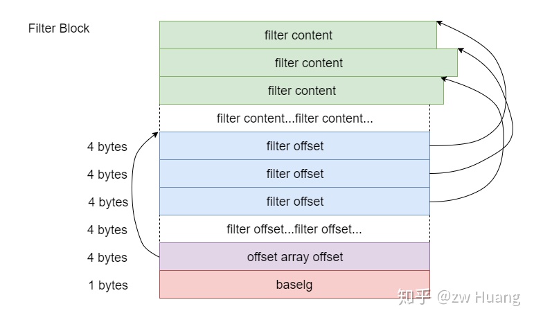 - 在Data Block后是Filter Block,也设计成为多个,目前只使用了一个,存储了布隆过滤器的二进制数据;