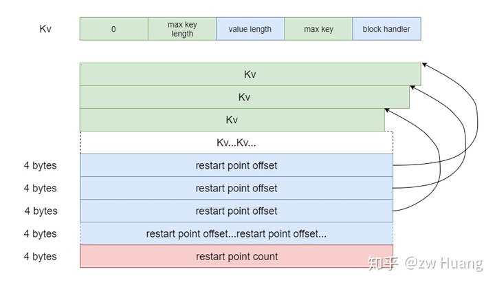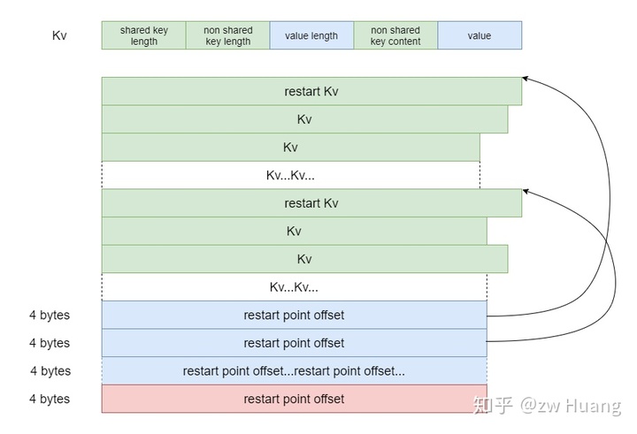 通过这种方式将多个Kv连续存放在Data Block里,可以进行键的前缀压缩。然而这样会有一个问题,不管得到哪一个键的值,都需要从Block的第一个键开始依次构造,搜索一个键的时候,也需要遍历整个Block,如果一个Block里有大量的键的话,效率会比较低。
