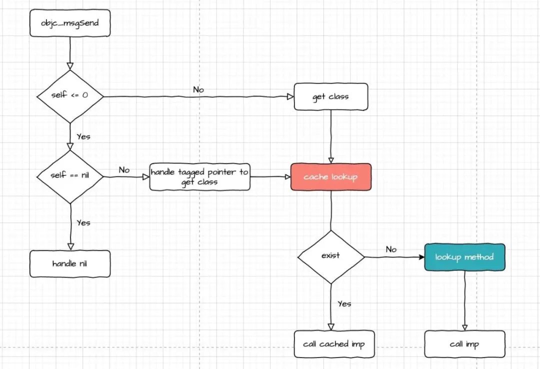 这里我将 objc_msgSend 的流程大致捋了一遍,包括 class 查找、缓存查找、缓存未命中的处理、taggedPointer 和 nil 处理。对于 class 查找的过程,是比较核心的一部分。不同类型的对象有着不同的查找方式,相信如果弄懂了这部分,对于对象结构的布局会有进一步的理解。