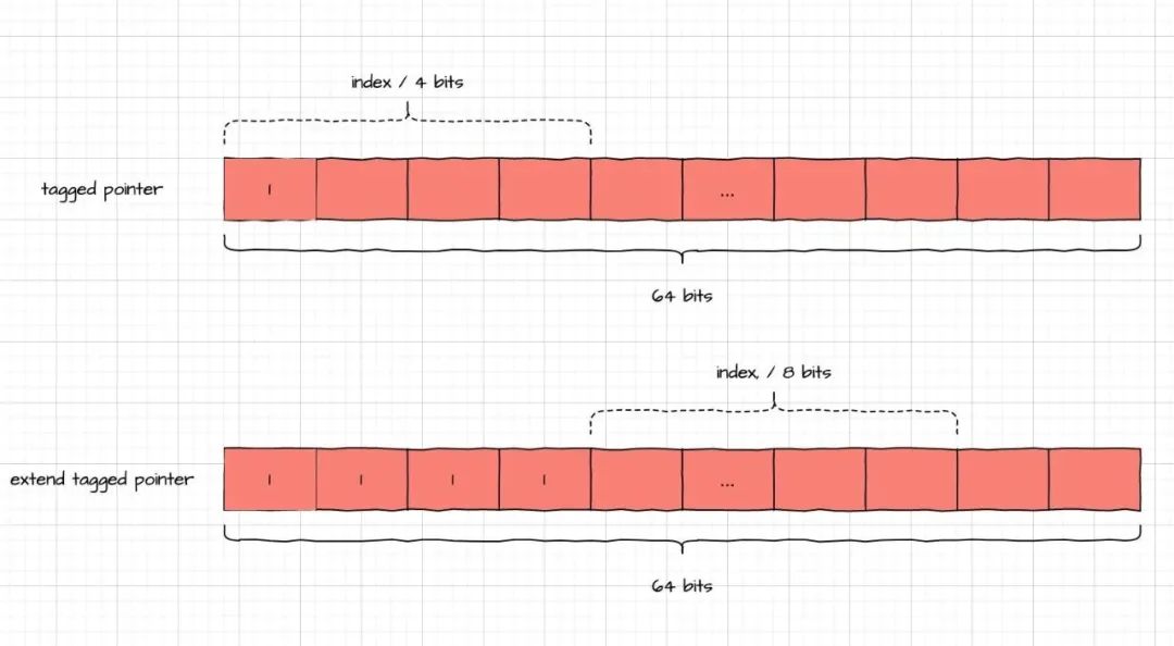 - 如果是 Extend Tagged Pointer,由于高 4 位都为 1,那么接下来的 8 位表示索引,到 Extend Tagged Pointer Table 表中查找。