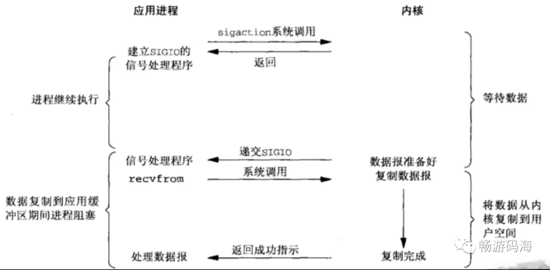 - 当socket上的数据被读入用户缓冲区后,内核将向应用程序发送一个信号,以通知应用程序数据已经可用
