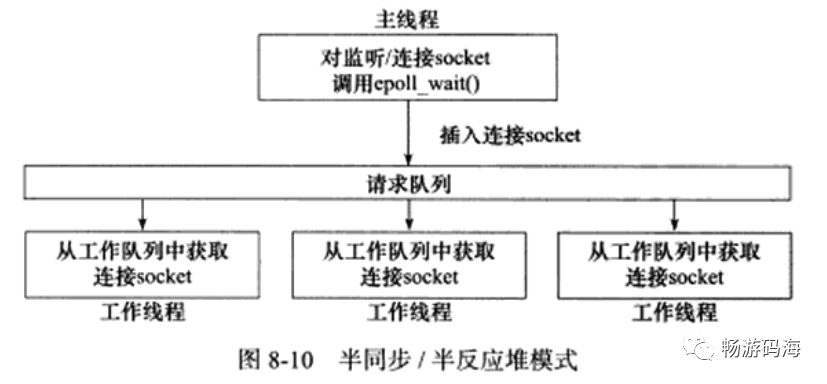 主线程只管理监听socket,连接socket由工作线程来管理。当有新的连接到来时,主线程就接受并将新返回的连接socket派发给某个工作线程,此后该新socket上的任何I/O操作都由被选中的工作线程来处理,直到客户关闭连接。主线程向工作线程派发socket的最简单的方式,是往它和工作线程之间的管道里写数据。工作线程检测到管道上有数据可读时,就分析是否是一个新的客户连接请求到来。如果是,则把该新socket上的读写事件注册到自己的epool内核事件表中