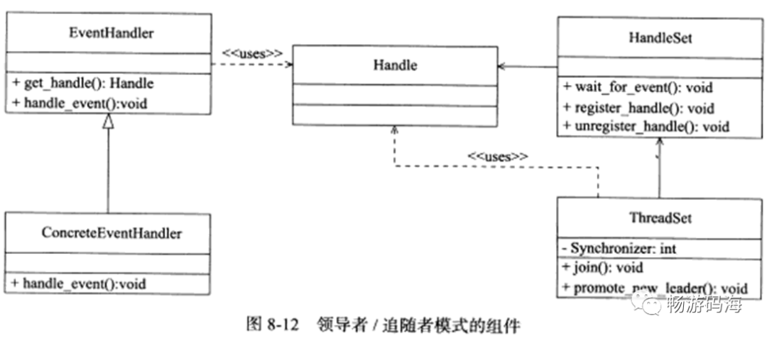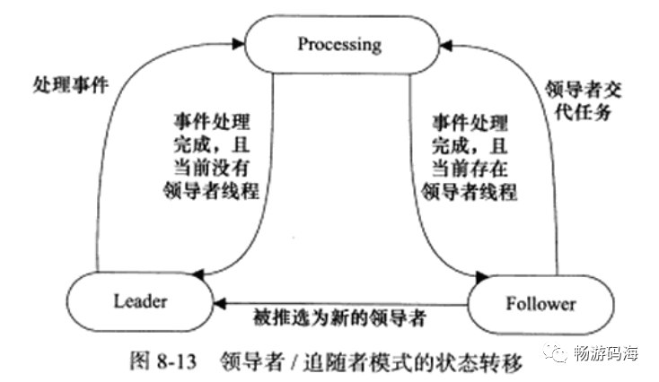 Leader:线程当前处于领导者身份,负责等待句柄集上的I/O事件**Processing:线程正在处理事件。领导者检测到I/O事件之后,可以转移到processing状态来处理该事件,并调用promote_new_leader方法推选出新的领导者:也可以指定其他追随者来处理事件,此时领导者的地位不变。当处于processing状态的线程处理完事件之后,如果当前线程集中没有领导者,则它将成为新的领导者,否则它就直接转变为追随者**Follower:线程当前处于追随者身份,通过调用线程集dejoin方法等待成为新的领导者,也可能被当前的领导者指定来处理新的任务