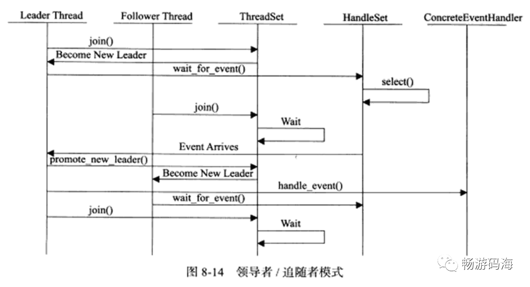 领导者/追随者模式是多个工作线程轮流获得事件源集合、轮流监听、分发并处理事件的一种模式。在任意时间点,程序仅有一个领导者线程,它负责监听I/O事件。而其他线程则都是追随者,它们休眠在线程池中等待成为新的领导者。当前的领导者如果检测到I/O事件,首先要从线程池中推选出新的领导者线程,然后处理I/O事件。此时,新的领导者等待新的I/O事件,而原来的领导者则处理I/O事件,二者实现并发