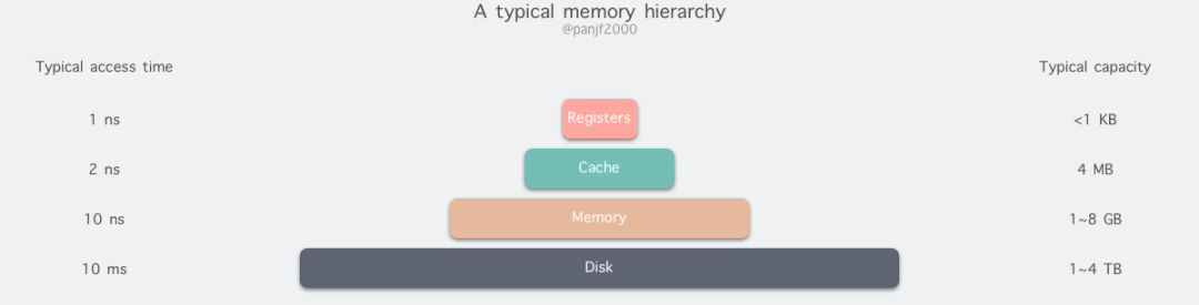 从顶至底,现代计算机里的存储器类型分别有:寄存器、高速缓存、主存和磁盘,这些存储器的速度逐级递减而容量逐级递增。存取速度最快的是寄存器,因为寄存器的制作材料和 CPU 是相同的,所以速度和 CPU 一样快,CPU 访问寄存器是没有时延的,然而因为价格昂贵,因此容量也极小,一般 32 位的 CPU 配备的寄存器容量是 32✖️32 Bit,64 位的 CPU 则是 64✖️64 Bit,不管是 32 位还是 64 位,寄存器容量都小于 1KB,且寄存器也必须通过软件自行管理。