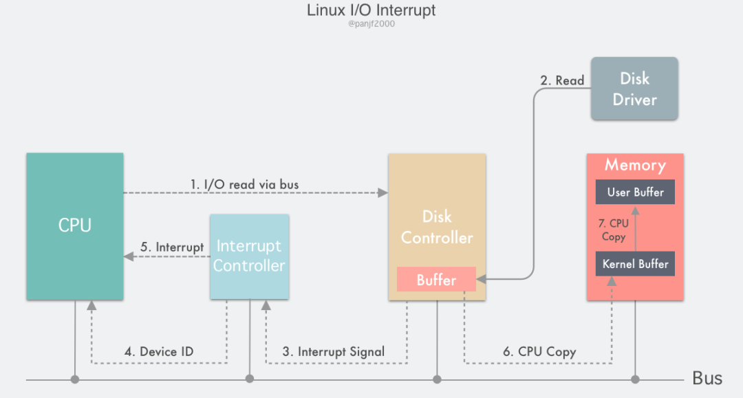 read()系统调用读取磁盘文件,陷入内核态并由其所在的 CPU 通过设备驱动程序向设备寄存器写入一个通知信号,告知设备控制器 (我们这里是磁盘控制器)要读取数据; - 磁盘控制器启动磁盘读取的过程,把数据从磁盘拷贝到磁盘控制器缓冲区里;