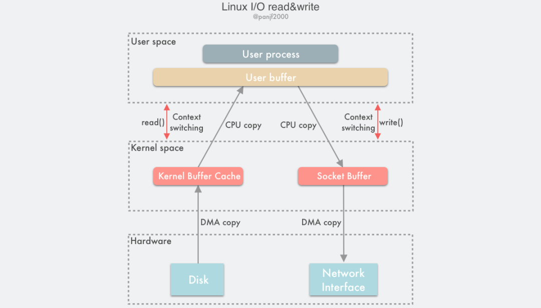 传统 IO 的工作方式,从硬盘读取数据,然后再通过网卡向外发送,我们需要进行 4 上下文切换,和 4 次数据拷贝,其中 2次数据拷贝发生在内存里的缓冲区和对应的硬件设备之间,这个是由 DMA 完成,另外 2 次则发生在内核态和用户态之间,这个数据搬移工作是由 CPU 完成的。