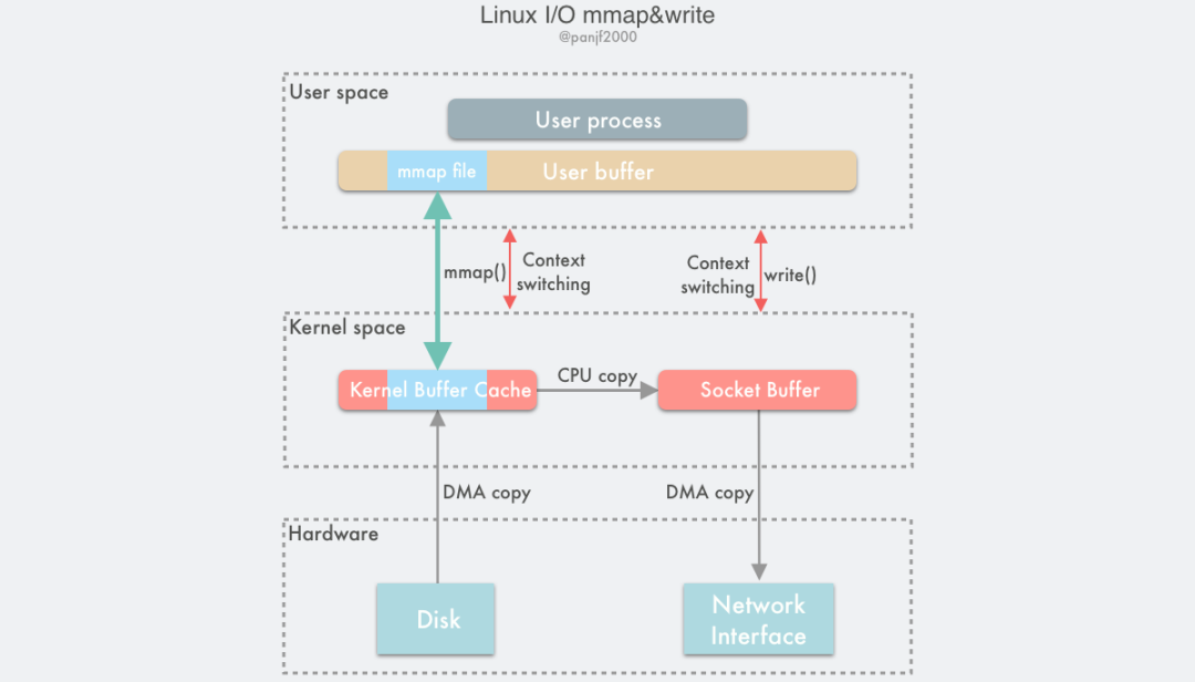 我们可以得知,通过使用 mmap() 来代替 read(), 可以减少一次数据拷贝的过程。