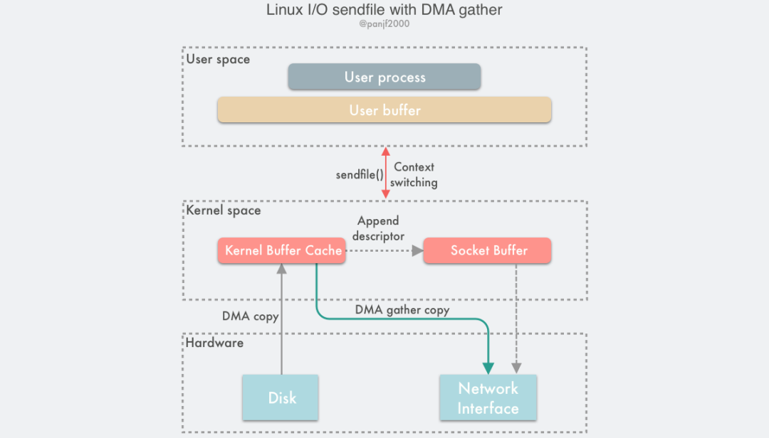 于是,从 Linux 内核 2.4 版本开始起,对于支持网卡支持 SG-DMA 技术的情况下, sendfile()系统调用的过程发生了点变化,具体过程如下: