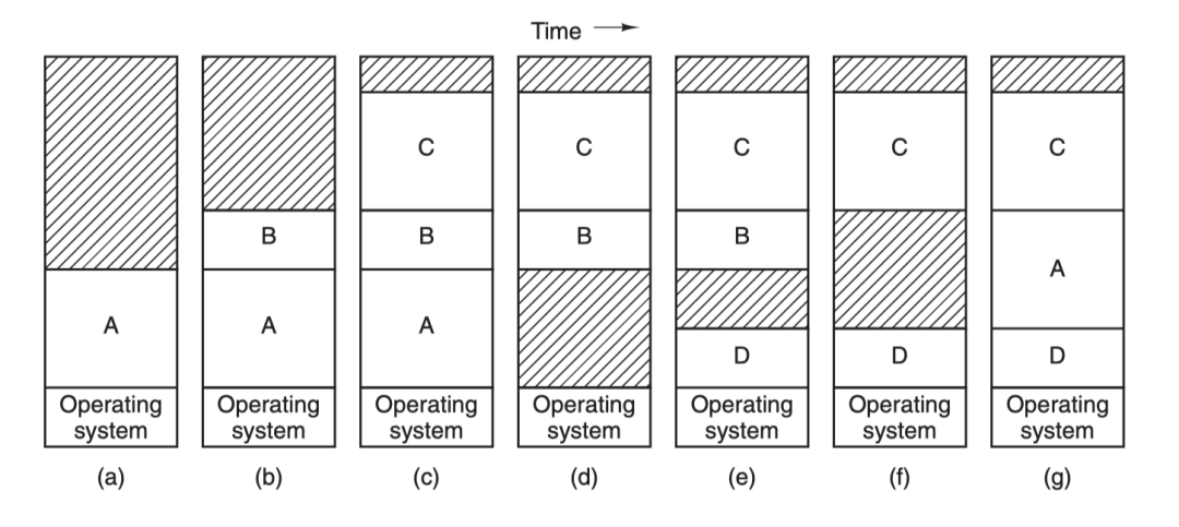 先把进程 A 换入内存,然后启动进程 B 和 C,也换入内存,接着 A 被从内存交换到磁盘,然后又有新的进程 D 调入内存,用了 A 退出之后空出来的内存空间,最后 A 又被重新换入内存,由于内存布局已经发生了变化,所以 A 在换入内存之时会通过软件或者在运行期间通过硬件(基址寄存器和界限寄存器)对其内存地址进行重定位,多数情况下都是通过硬件。