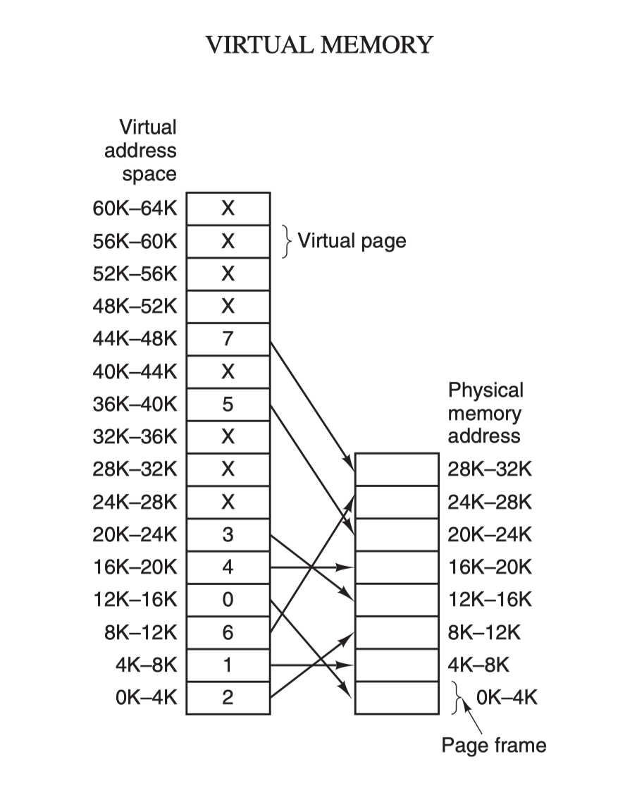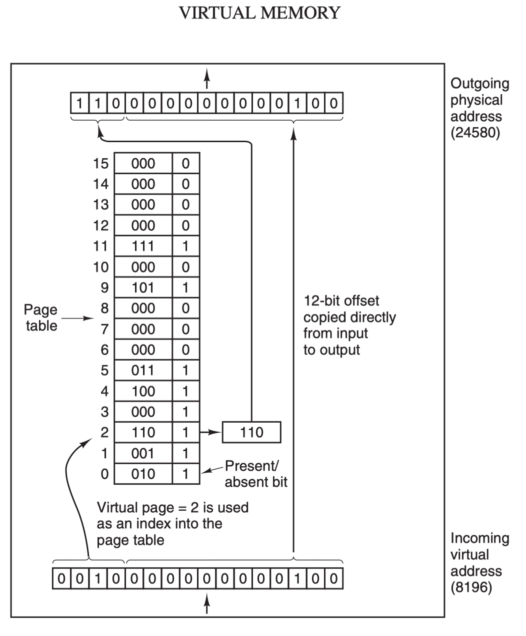 虚拟地址(比如 16 位地址 8196=0010000000000100)分为两部分:虚拟页号(高位部分)和偏移量(低位部分),虚拟地址转换成物理地址是通过页表(page table)来实现的,页表由页表项构成,页表项中保存了页框号、修改位、访问位、保护位和 "在/不在" 位等信息,从数学角度来说页表就是一个函数,入参是虚拟页号,输出是物理页框号,得到物理页框号之后复制到寄存器的高三位中,最后直接把 12 位的偏移量复制到寄存器的末 12 位构成 15 位的物理地址,即可以把该寄存器的存储的物理内存地址发送到内存总线: