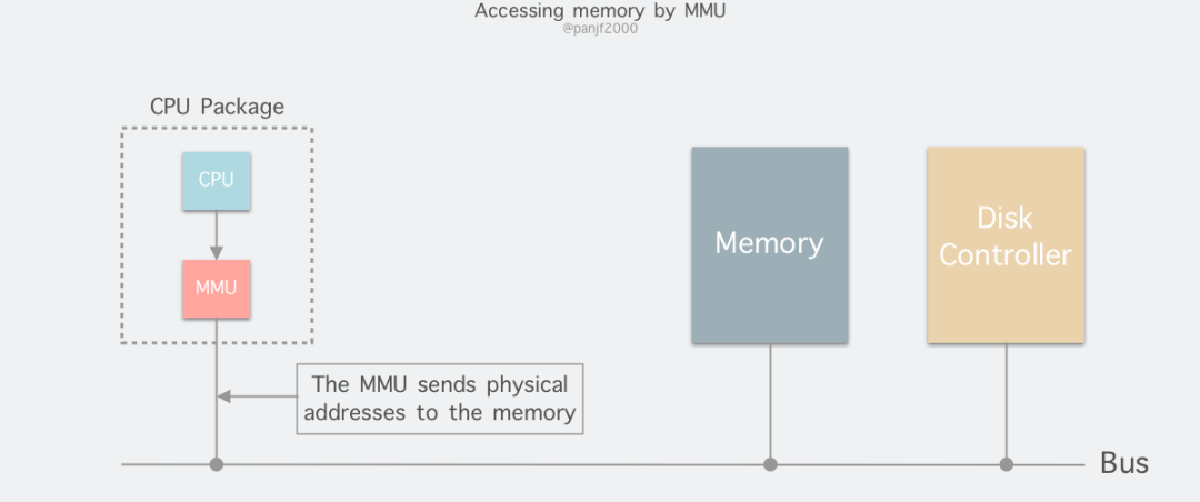 进程在运行期间产生的内存地址都是虚拟地址,如果计算机没有引入虚拟内存这种存储器抽象技术的话,则 CPU会把这些地址直接发送到内存地址总线上,直接访问和虚拟地址相同值的物理地址;如果使用虚拟内存技术的话,CPU则是把这些虚拟地址通过地址总线送到内存管理单元(Memory Management Unit,MMU),MMU将虚拟地址映射为物理地址之后再通过内存总线去访问物理内存: