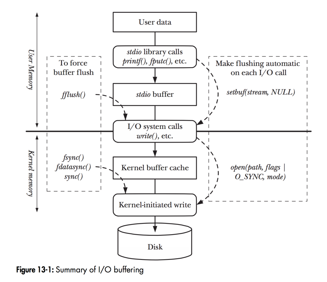 在 Linux 中,当程序调用各类文件操作函数后,用户数据(User Data)到达磁盘(Disk)的流程如上图所示。