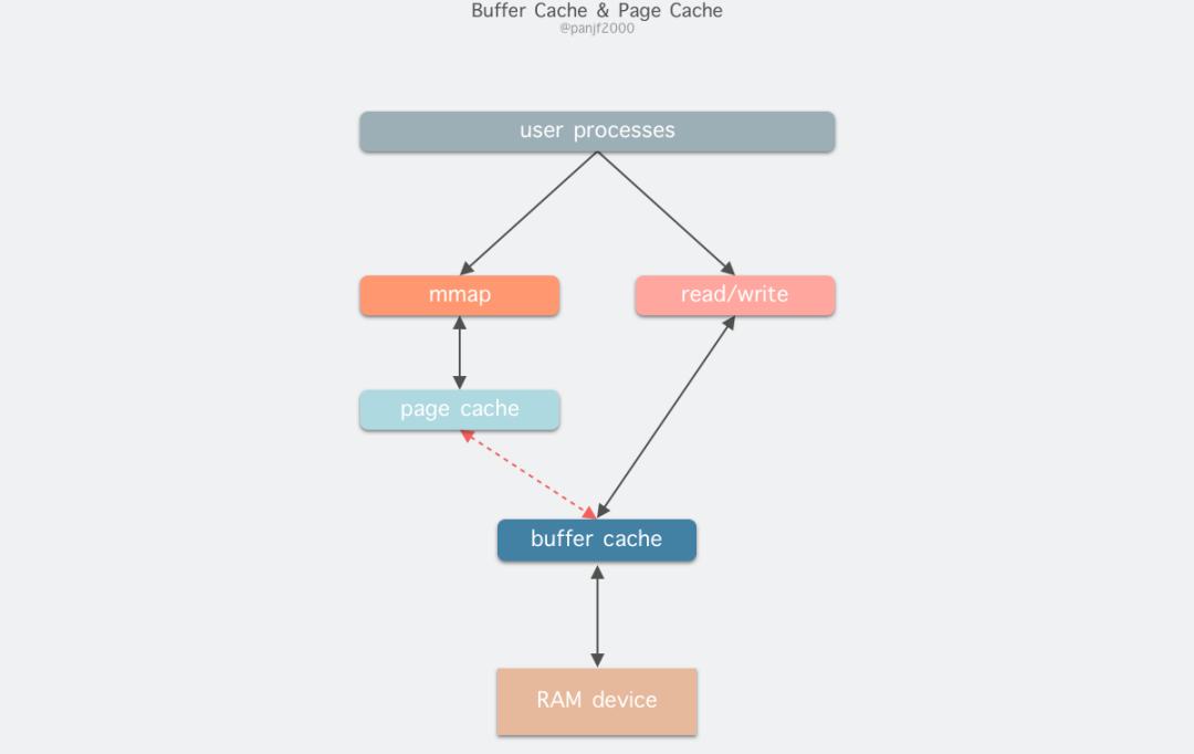 融合之后就可以统一操作 Page Cache 和 Buffer Cache:处理文件 I/O 缓存交给 Page Cache,而当底层 RAW device 刷新数据时以 Buffer Cache 的块单位来实际处理。