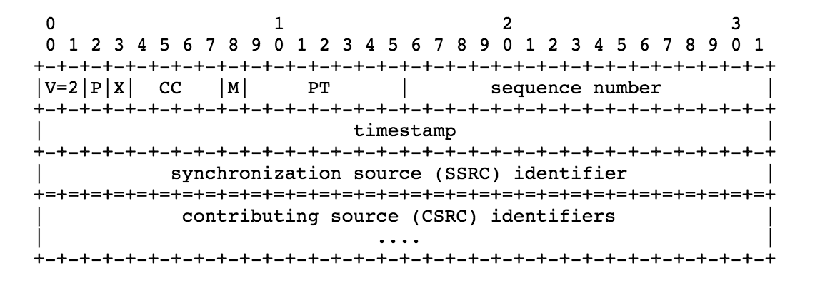 - CSRC list:0 ~ 15 items, 32 bits each CSRC list表示对该payload数据做出贡献的所有SSRC。这个字段包含的SSRC数量由CC字段定义。如果有超过15个SSRC,只有15个可以被记录。