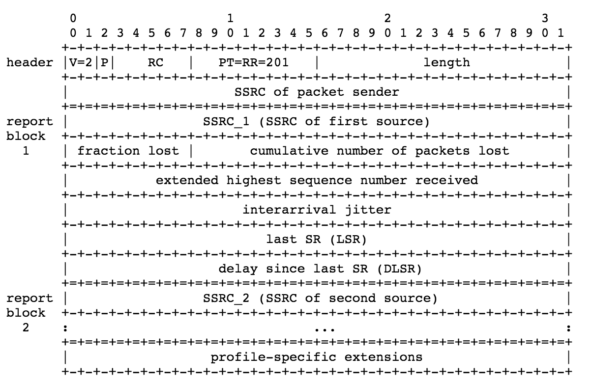 - Additional RRs:如果接受的RTP数据来自超过31个不同的源,前31个接受报告会写进SR或者RR报文中,多出来的接受报告应该紧跟着默认的报告报文(SR或RR)。